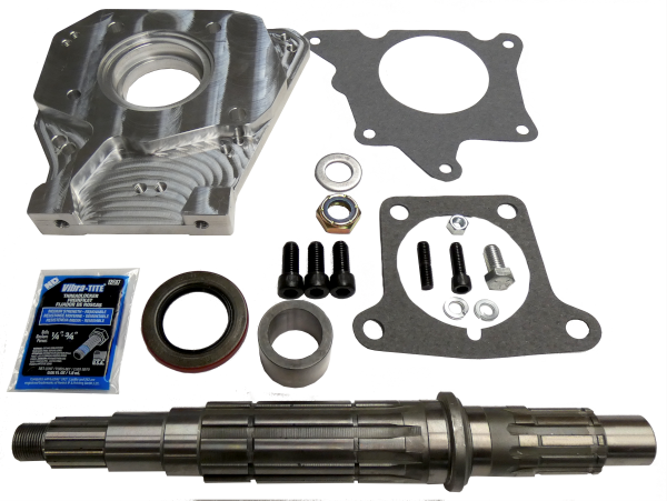 The kit contains aluminum adapter housing, transmission output shaft, seal, seal sleeve, transfer case to adapter gasket, transmission to adapter gasket, fastening hardware, steel mounting base, and instructions.